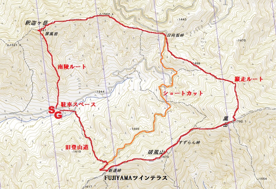 日が短い時期なので、時間によっては周回ルートを途中でショートカットしてFUJIYAMAツインテラスに向かいます。メインは釈迦ヶ岳とFUJIYAMAツインテラスです。